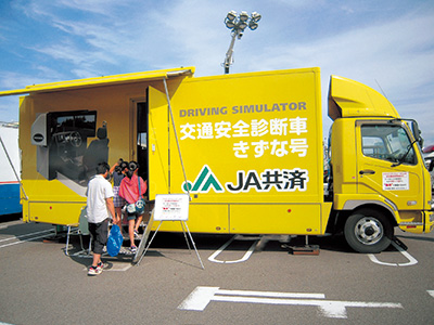 交通事故を防ぐため、シュミレーター搭載車両を全国各地に派遣し、巡回型の交通安全診断を行っています。
