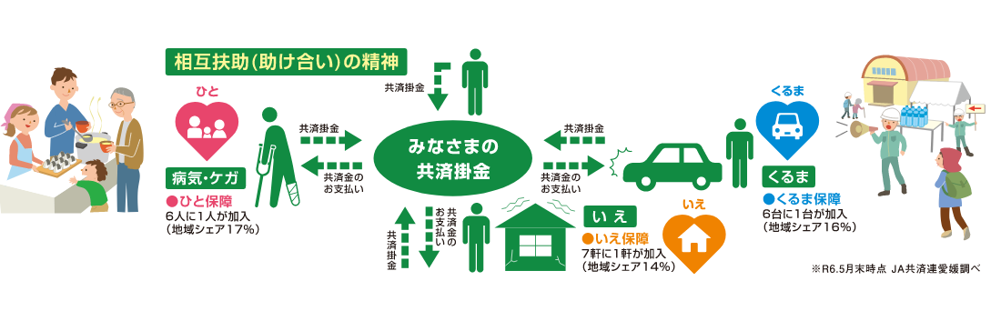 JAは相互扶助の精神をもとに農家および組合員・ 地域住民の生活を守り高め、よりよい地域社会を築くことを目的に、組合員の運営参画により組織された協同組合です。JA共済は、JAグループの一員として、ひと・いえ・くるまの総合保障の提供を中心とした活動と地域貢献活動を通じて、組合員・ 地域の皆さまへ「安心」と「満足」を提供しています。